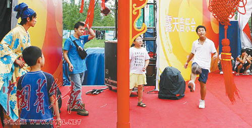 8月11日,来自山东临淄的蹴鞠足球队在中华世纪坛表演,吸引了众多热情的市民上场尝试。