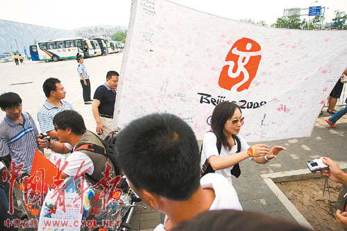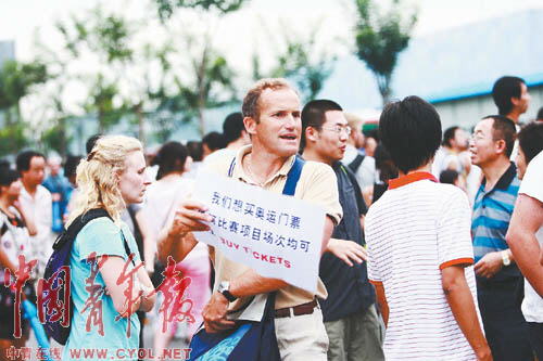 8月11日,北京国家游泳中心“水立方”前,一位外国游客急切地求购奥运比赛门票。
