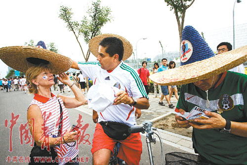 8月11日,北京国家体育场“鸟巢”附近,来自墨西哥的游客正和来自美国的女士交换帽子。