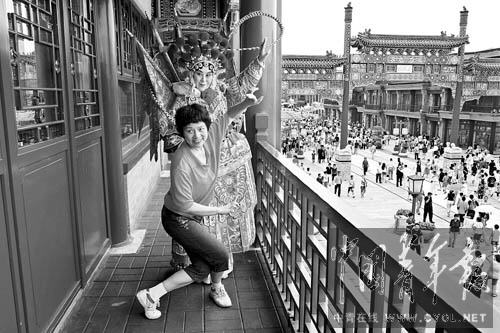 8月11日,大北照相馆,一位女士穿起戏装,在化妆师的指导下在照相机前摆起了姿势。前门大街的这家北京老字号店铺,是赶在奥运期间营业的老店之一。几天前,以清末民初情景复原后的前门大街,正式向游客开放。