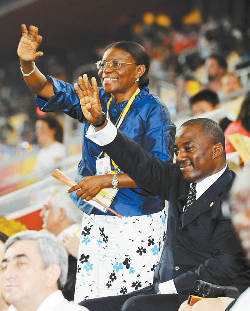 8月8日,刚果(金)总统卡比拉在北京奥运会开幕式上向运动员致意。新华社记者 黄敬文摄