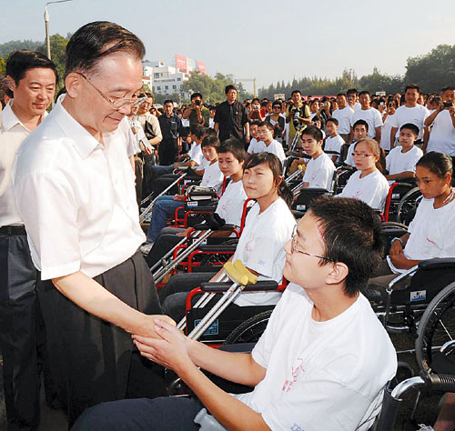 温家宝专门绕过一片灌木,来到20多位在地震中受伤、坐在轮椅上的同学们中间。温总理伸出手,和每一位同学有力握手。最后,他望着这些受伤的孩子们,大声说:“要坚强!”