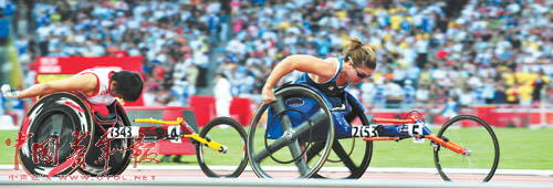 9月10日,美国选手杰茜卡·加利(右)与中国选手周红转在女子400米T53级决赛中,分获冠亚军。 新华社记者杜 华举摄 |