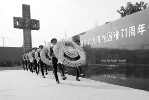 照片:12月13日,武警战士在江苏省暨南京市各界悼念南京大屠杀30万同胞遇难71周年的仪式上为遇难者敬献花圈。 新华社记者 韩瑜庆摄