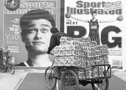上海,一位工人正用力踏着一辆装满可口可乐的人力车行驶在街头,车旁是一幅印有姚明头像的美国NBA体育杂志的广告。2008年12月14日晚,由大学生组成的社会调查小组,在北京中央民族大学发布《可口可乐调查报告》,称可口可乐严重侵害派遣工利益,呼吁姚明、刘翔停止为可口可乐代言。