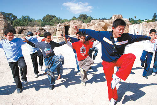 受商务部、团中央的委托,团贵州省委、贵州省志愿者协会向突尼斯选派彭学艳、唐勇等6名援外青年志愿者。志愿者们在突尼斯不辞辛劳,克服生活、语言等方面的困难,热心服务,广交朋友,他们服装上醒目的国旗和“中国青年志愿者”标志成为当地一道靓丽的风景线。图为唐勇在教授当地青少年学习中国武术。