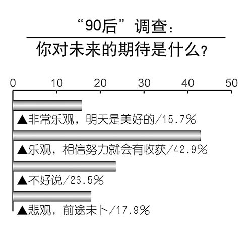 但大部分“90后”对于未来仍然积极乐观。调查中,42.9%的“90后”表示“乐观,相信努力就会有收获”,15.7%的“90后”表示“非常乐观,明天是美好的”,仅有17.9%的“90后”觉得“悲观,前途未卜”,另有23.5%的“90后”觉得不好说。