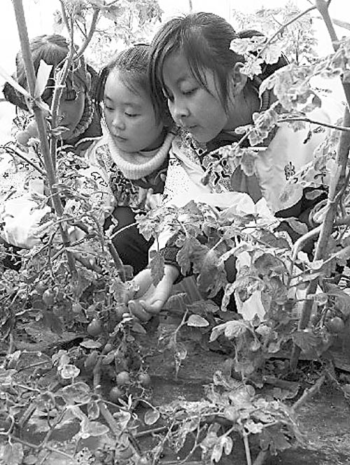 几名小学生在果蔬采摘区体验采摘的乐趣(图)