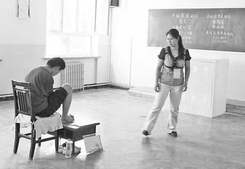 6月7日,新疆生产建设兵团农七师高级中学的“无臂”考生钱程,在奎屯市二中考点的特殊考场参加2009年普通高等学校招生考试。