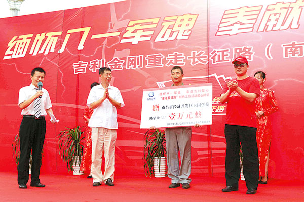 清晨,金刚2代长征车队驶过横跨赣江的洪都大桥,来到南昌最大的汽车销售店——江西和众汽车销售服务有限公司。在这里,吉利汽车举行了一场捐赠仪式,向南昌市经济技术开发区的卫国学校捐赠了1万元人民币。“1万元不算多,但代表了吉利汽车的浓浓深情。”吉利相关人士说。