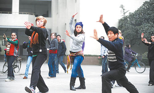 几名美国学生跟着老师学打太极拳(图)