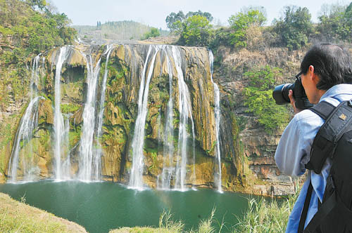 3月21日,一名游客在拍摄黄果树瀑布。2009年10月至今,亚洲第一大瀑布黄果树瀑布所在的安顺市遭遇罕见的冬春季节大干旱,辖区内90%的河流、水库都已干枯。黄果树景区在保证当地抗旱用水的前提下,采取调节水库晚上蓄水、白天放水的方式,保证景观用水。