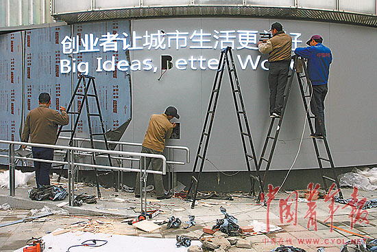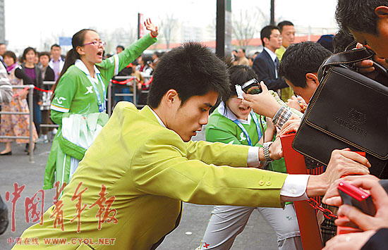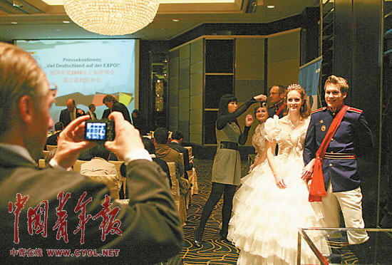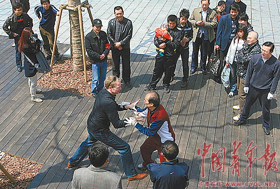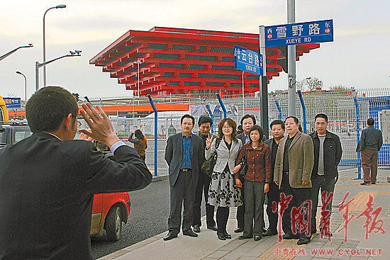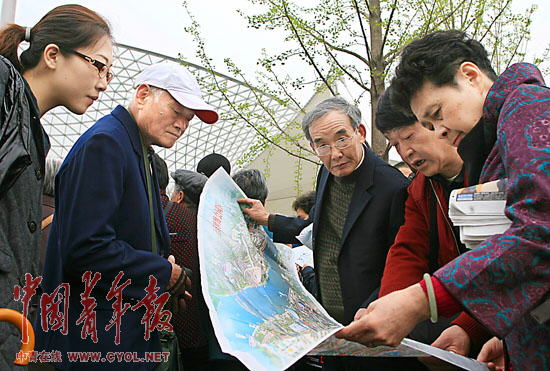 4月20日,世博会迎来首场试运行。中国馆前,面对涌来的参观者,志愿者和工作人员奋力维持秩序。