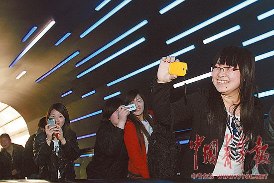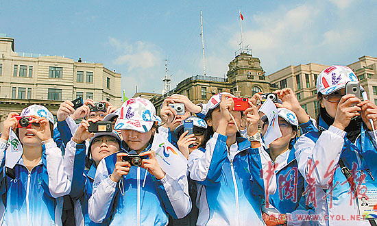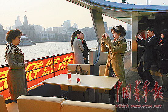 在黄浦江首航的“中国人寿世博游船”上,游客们面对因世博而更美的城市风景,纷纷拍照留念。