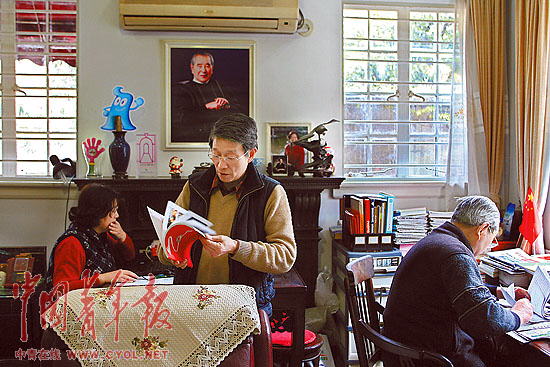 居住在上海弄堂愚谷村的“世博人家”王守华(中)夫妇正和他94岁的岳父一道翻阅资料,为即将到来的世博会做准备。