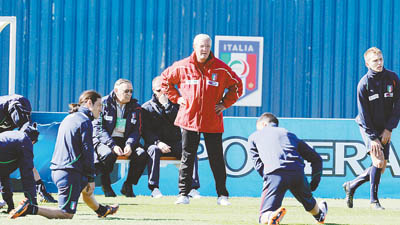 上一场首发的前锋亚昆塔和吉拉迪诺在射门训练时状态不佳,替补前锋迪纳塔莱也在无人防守的情况下把球打偏。这样的场面让主教练里皮一脸严肃。虽然小组出线形势尚好,但意大利媒体的质疑和目前这支卫冕冠军的状态,实在无法让里皮保持良好的心情。实际上,在前一天的训练中,里皮已经向队员施压,要求队员加强攻势。