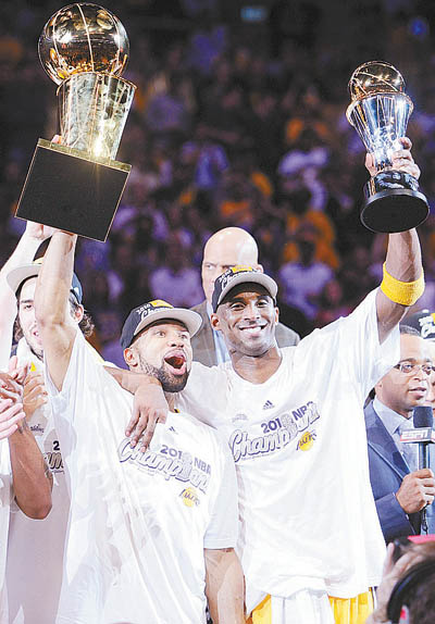 6月18日,湖人队在主场以83∶79战胜凯尔特人队,以4∶3的总比分夺得NBA本赛季总冠军。图为湖人队球员费舍尔(前左)和队友科比(前右)分别举起总冠军奖杯和最有价值球员奖杯。