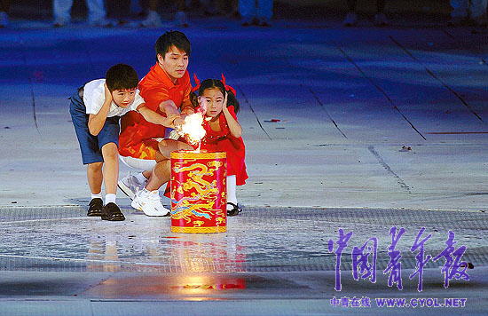 当最后一棒火炬手何冲手持火炬小跑到4个立柱下方的时候,还有人以为他会以跳水运动员特有的姿态跳到立柱之上去点燃圣火,直到一男一女两个少年,抱着一个巨大的爆竹放在何冲面前,人们才恍然大悟,百思不解的答案揭晓了。