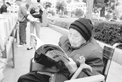 11月15日,江西省宜春市靖安县双溪镇双溪村一位96岁高龄老人在县图书馆组织的书集上阅读图书。