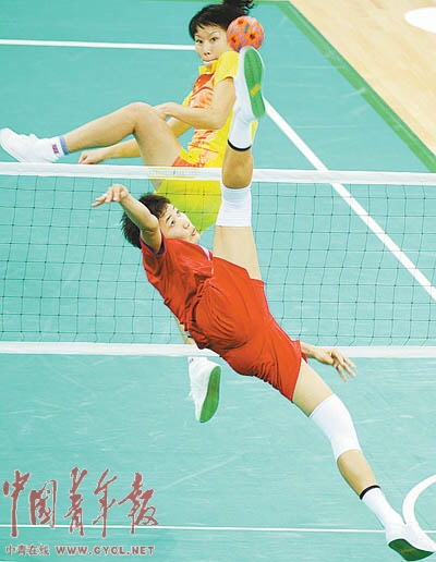 11月20日,在广州亚运会藤球女子团体的决赛中,泰国队(下)以总分2∶0战胜中国队夺得冠军,中国队惜败得银。