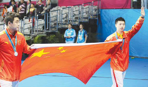 11月20日,中国选手马龙(右)和王皓在颁奖仪式后手举国旗向观众致意。当日,在第16届亚运会乒乓球男子单打决赛中,马龙以4∶2战胜队友王皓,夺得冠军,王皓获得亚军。