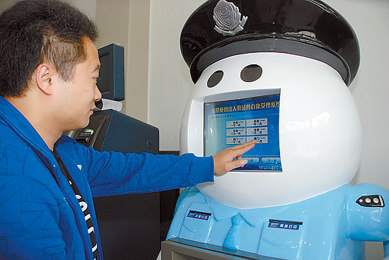 当日,全国首个以民警卡通形象为蓝本,集自助受理和自助填表功能于一体的“办证机器人”在福建泉州市公安局出入境办证大厅正式投入使用。颜财斌摄(新华社发)