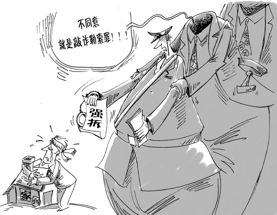 河南省长垣县蒲西区7旬老人刘玉山因不满拆迁补偿而拒签协议,被当地警方以涉嫌敲诈勒索为由逮捕,关押近半年。区领导称老人的不配合致政府多次被县里批评。而这起“敲诈案”的起诉意见书并未明确受害方是谁,涉事开发商也否认遭到敲诈。(《河南日报》11月24日)漫画:徐简