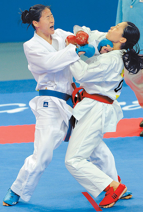 11月26日12点20分许,在一片倒计时声中,中国选手冯兰兰(左)在女子68公斤级空手道比赛中赢得金牌。中国代表团在广州亚运会上的第184枚金牌诞生了!20年前的北京亚运会上中国代表团获得183枚金牌的纪录被刷新,中国亚运历史翻开了新的篇章。