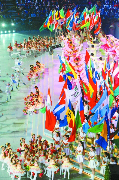 浦江两岸灯火璀璨,申城之夜流光溢彩。造型宛若飞碟的上海世博文化中心内,8000多名观众欢聚一堂。当时针指向20时,上百名天真烂漫的少年儿童手持绚丽的花束和花环走上舞台中央,组成喜庆的花坛。两侧台阶上,200多位少女手执世博会参展国家和国际组织的旗帜,整齐站立。舞台旁,中华人民共和国国旗和国际展览局旗、上海世博会旗高高飘扬。