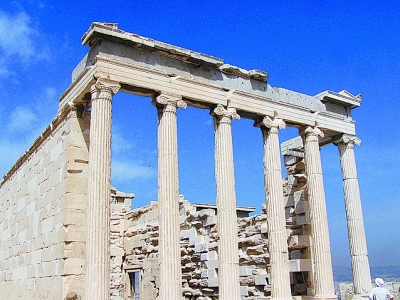 伊瑞克提翁(Erechtheion)神庙位于帕特农神庙的对面。那是传说中雅典娜女神和波塞冬斗智的地方。虽然雅典人民最终选择了雅典娜作为保护神,但也未忘记海神给予的舟楫之便,伊瑞克提翁神庙就是献给波塞冬的。这座神庙的设计别出心裁,依山就势,结构复杂但不繁杂,造型多变但又完整。神庙的南端,用6根大理石雕刻而成的少女像柱顶起大殿的石顶。6位少女长裙束胸,亭亭玉立。雕塑与建筑和谐统一,既满足了建筑诉求又成就了美学需要,如此完美的伊瑞克提翁神庙居然建于2400多年前,很难说清我们的感动与震撼究竟是因为人,还是因为神。