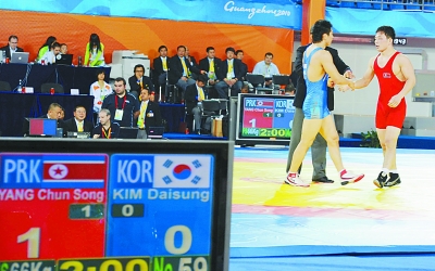 11月24日,在广州亚运会男子66公斤级自由式摔跤第一轮比赛结束后,韩国选手金大成和朝鲜选手梁正成握手致意。《每日新闻》记者 西本胜摄