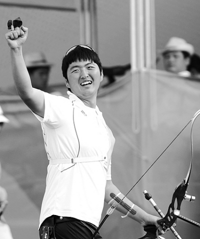 11月24日,韩国选手金优镇获得广州亚运会射箭男子个人赛冠军。本报记者 陈 剑摄