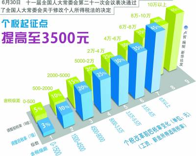 财政部税政司副司长王建凡今天表示,此次起征点从2000元提高到3500元,是个人所得税法实施以来第三次调整。此次修改将会大幅度减轻中低收入纳税群体的负担,起征点由2000元提高到3500元以后,纳税人纳税负担普遍减轻,此次提高后,我国工薪收入者需要缴纳个人所得税的比例,由目前的约28%下降到约7.7%,纳税人数由目前的约8400万人减至约2400万,有约6000万人不需要缴纳个人所得税。