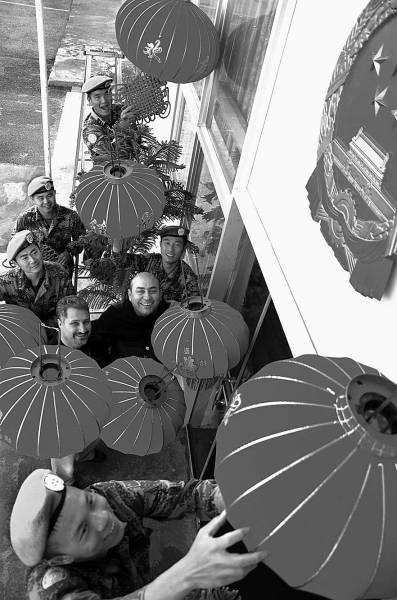 2月7日,在联合国驻黎巴嫩南部临时部队(联黎部队)司令部所在的“UN城”里,中国第十批赴黎巴嫩维和工兵营官兵与友军代表一起挂灯笼、贴对联,喜迎农历蛇年春节。