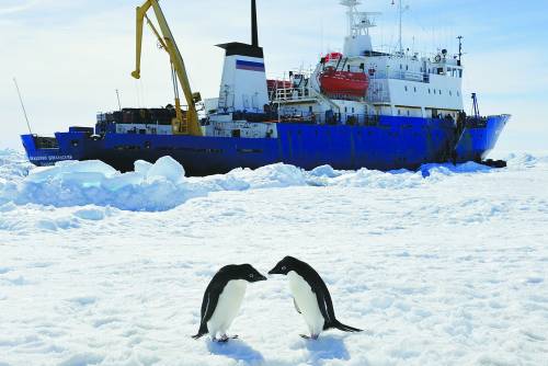 两只企鹅在俄罗斯“绍卡利斯基院士”号前“亲吻”