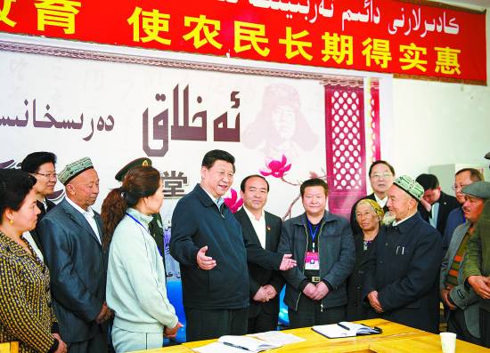 春天的新疆大地,万物复苏,生机盎然。4月27日至30日,习近平和中共中央政治局常委、全国政协主席俞正声,在中共中央政治局委员、新疆维吾尔自治区党委书记张春贤和自治区政府主席努尔·白克力陪同下,来到喀什和乌鲁木齐等地,深入乡村、企业、部队、学校、基层派出所、清真寺和新疆生产建设兵团,实地了解新疆经济社会发展情况,看望各族干部群众和部分长期在新疆工作的老同志,对做好新疆维护社会稳定、推进跨越式发展、保障和改善民生、促进民族团结、加强党的建设等工作进行指导。