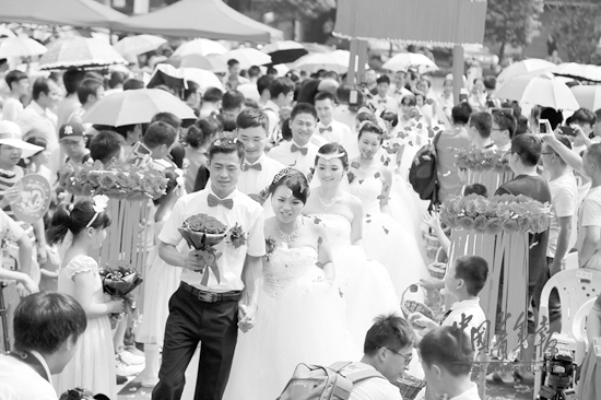 8月2日,传统“七夕”佳节当天,湖南长沙县8对因基层、梦想、奋斗而结缘的大学生村官,在“初恋”小镇开慧纪念馆前坪,举办集体婚礼。全县300余名大学生村官到场为他们送上祝福。