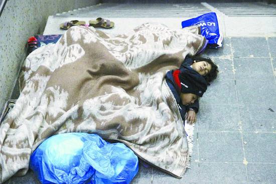 尽管天气已颇为寒冷,11月1日,一个叙利亚难民家庭在土耳其安卡拉地铁口的楼梯上睡觉。官方数据称,目前有160万名叙利亚难民在土耳其生活。尽管部分难民已找到临时性工作,但大多数人仍以乞讨为生。