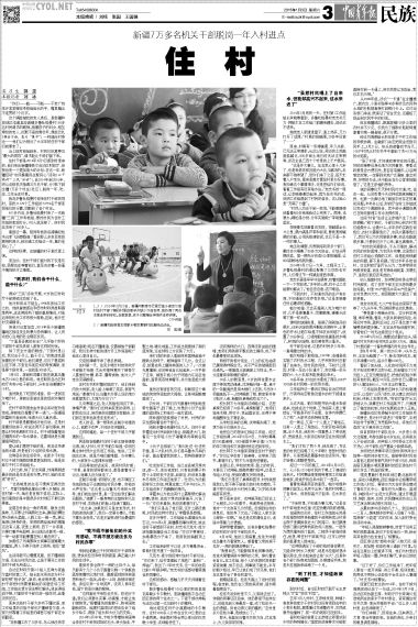 住村干部是2014年3月5日派到村里来的,他们来自新疆维吾尔自治区财政厅,但背后是一个更加庞大的计划:在这一年,新疆启动“访民情惠民生聚民心”活动(以下简称“‘三民’活动”),自2014年到2016年,将从各级机关抽调20万名干部,分3批下到全疆1万多个村庄(社区),脱岗一年,吃、住、工作全在村里。