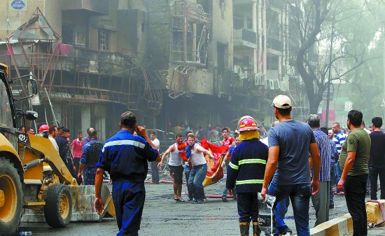 7月3日,在伊拉克首都巴格达南部卡拉达区,人们在汽车炸弹袭击现场转移遇难者遗体。