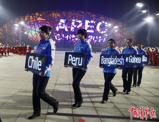 2014年11月10日,北京为APEC会议在北京奥林匹克公园举行焰火表演。表演结束后,志愿者拿着LED指示牌退场。 中青报·中青网记者 陈剑/摄