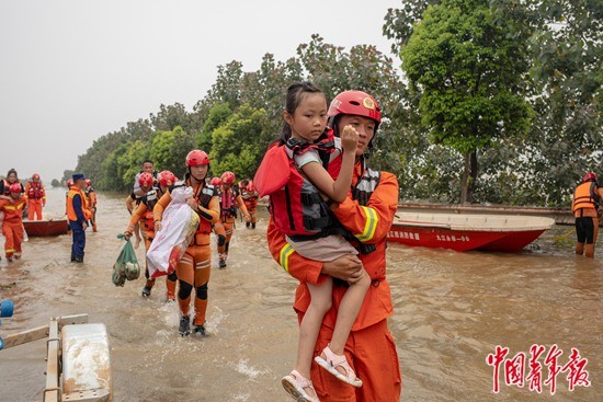 2020年7月15日中午,江西省九江市永修县三角乡红旗村,年轻的抢险队员在洪水中营救被困群众。 中青报·中青网记者 李隽辉/摄
