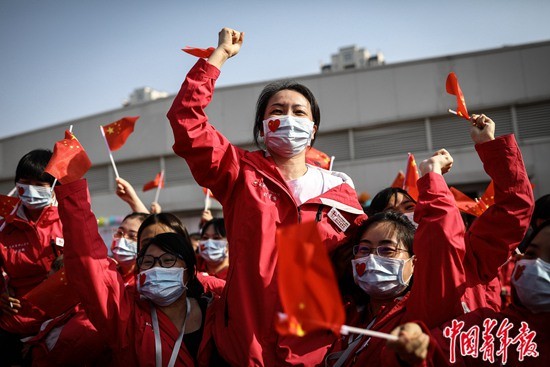 2020年4月9日,武汉市雷神山医院,最后一批援鄂医疗队集中撤离仪式上,挥舞国旗的青年医护人员。 中青报·中青网记者 赵迪/摄