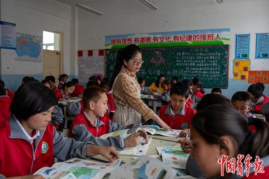 2019年4月8日,新疆阿克苏地区阿依巴格乡中学,20岁的支教老师苏芳在带领七年级的学生学习地理知识。一个月前,近600名大三学生来到师资紧缺的阿克苏地区,开始顶岗支教实习。 中青报·中青网记者 李隽辉/摄