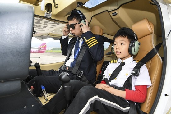 5月3日,在重庆龙兴通用机场,乘坐轻型运动类飞机的小朋友和机长在做出发前的准备。“五一”假期,重庆两江新区龙兴通用机场的低空旅游体验项目受到市民和游客青睐。体验者乘坐轻型运动类飞机,感受独特的乘坐体验,领略不一样的城市风景。新华社记者 王全超/摄