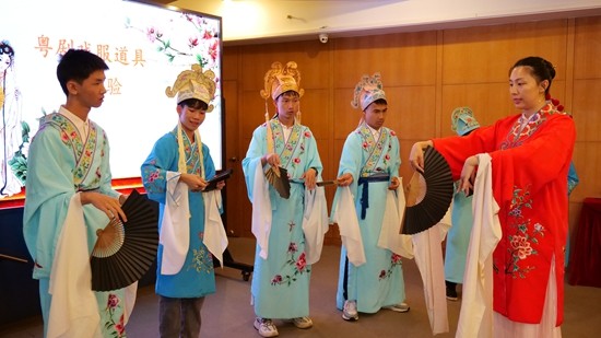 日前,40余名来自广东省清远市连山壮族瑶族自治县上帅镇中心学校的师生,在广州参加了为期5天的“精诚春蕾助学 助力乡村振兴”研学夏令营。图为在广州红线女艺术中心,孩子们体验粤剧文化。受访者供图
