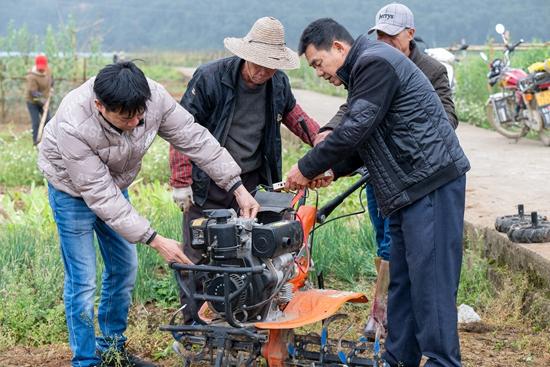 2月26日,广西梧州,长洲区倒水镇平石村的田间地头,农民正在修理微耕机,为春耕生产做好准备。视觉中国供图