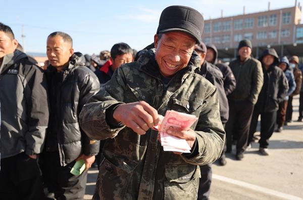 12月26日,在山东省临沂市沂南县苏村镇蔬香瓜甜瓜果蔬菜种植农民专业合作社联合社分红大会上,农民领到分红后数钱。