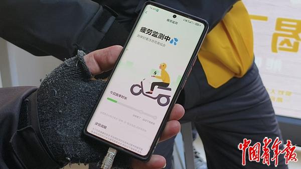 当天下午14∶30,他拿出手机,向中青报·中青网记者展示自己的“防疲劳”界面:界面上弹出5个大字“疲劳监测中”,下方一行小字提示骑手“跑单时要注意劳逸结合”,蓝色进度条显示当日跑单时长,达到8个小时后会提示“该休息了”,达到12个小时后会“启动下线休息”。此时,他的进度条远不到一半。