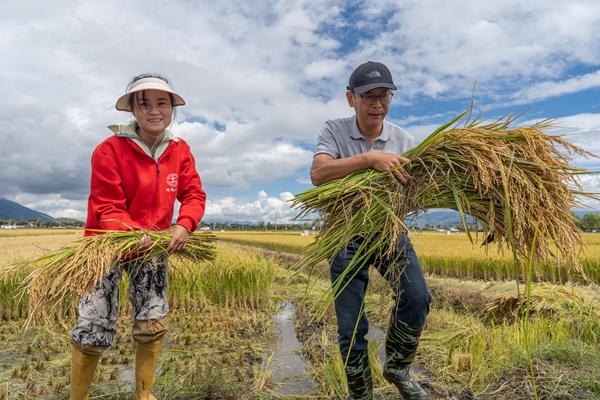 2023年,科技小院水稻示范田面积在洱海流域推广到2.2万亩。转眼又是一个秋天,谭玉娇和师妹们前往离古生村不远的喜洲古镇示范田取样测产——金黄色的稻田里,几个女学生脚踩大水鞋、手持大剪刀剪麦穗,与身边打卡拍照的游客格格不入。“但我心里可骄傲了!”谭玉娇说。